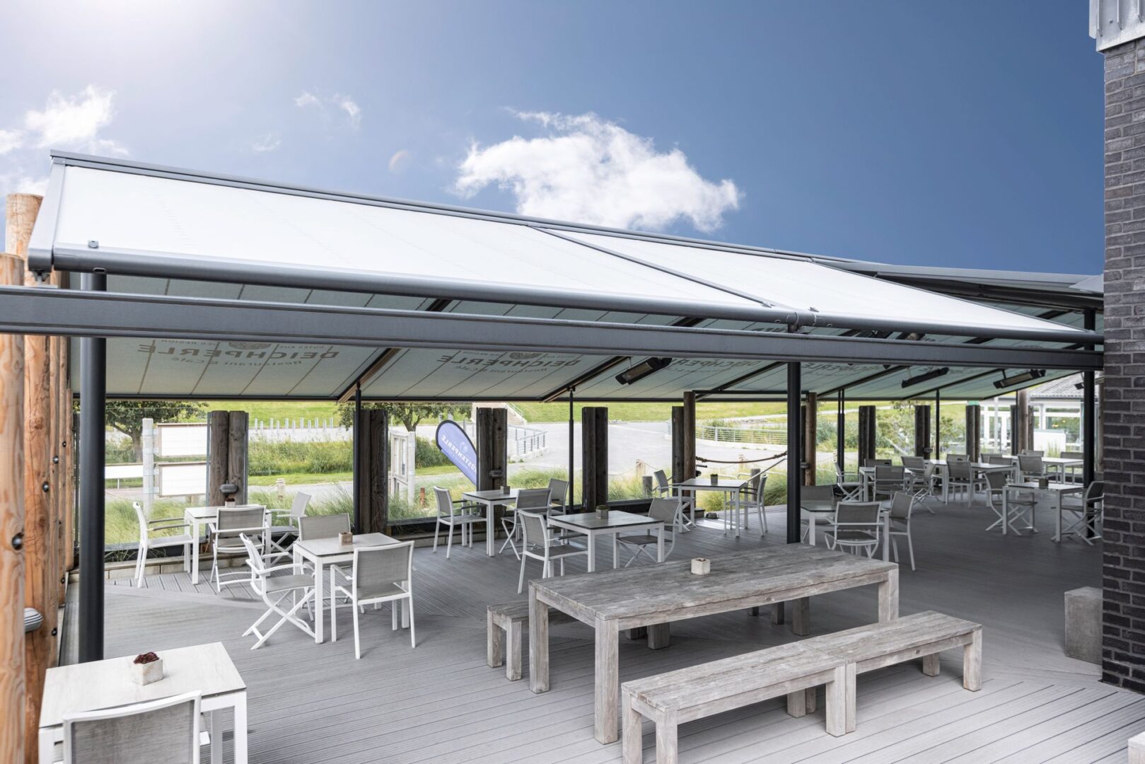Een Equa-Plu-Sol is eenvoudig te bedienen voor u en uw personeel. Met één druk op de knop verschijnt en verdwijnt het terrasscherm, zelfs als het scherm meer dan 100 vierkante meter overkapt. Daarnaast is de constructie van de Equa-Plu-Sol zeer robuust. Door het gebruik van hoogwaardig materieel, zowel in het doek als staal en elektra biedt de Equa-Plu-Sol de oplossing tegen wind en regen.
