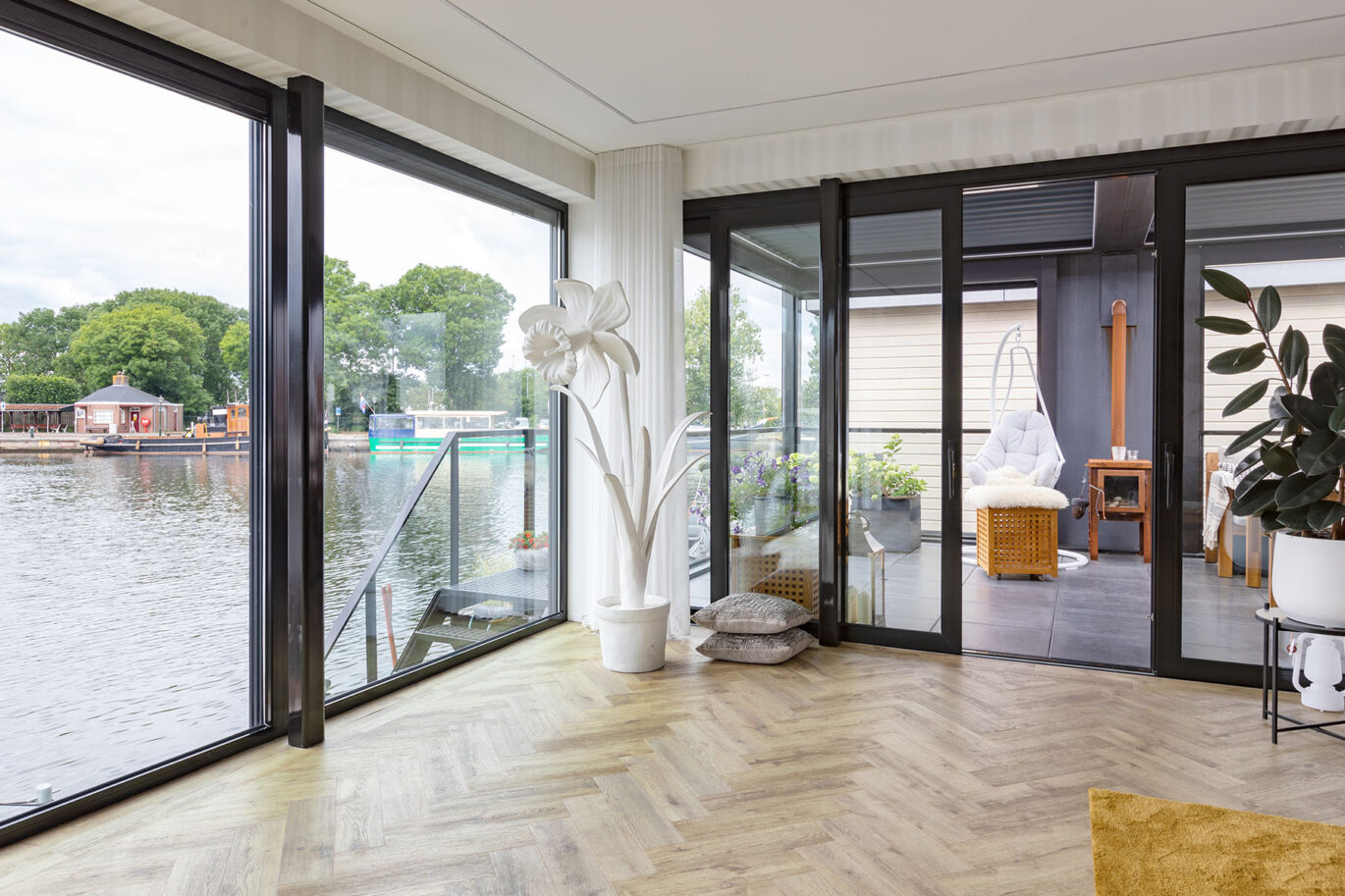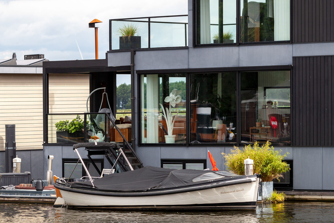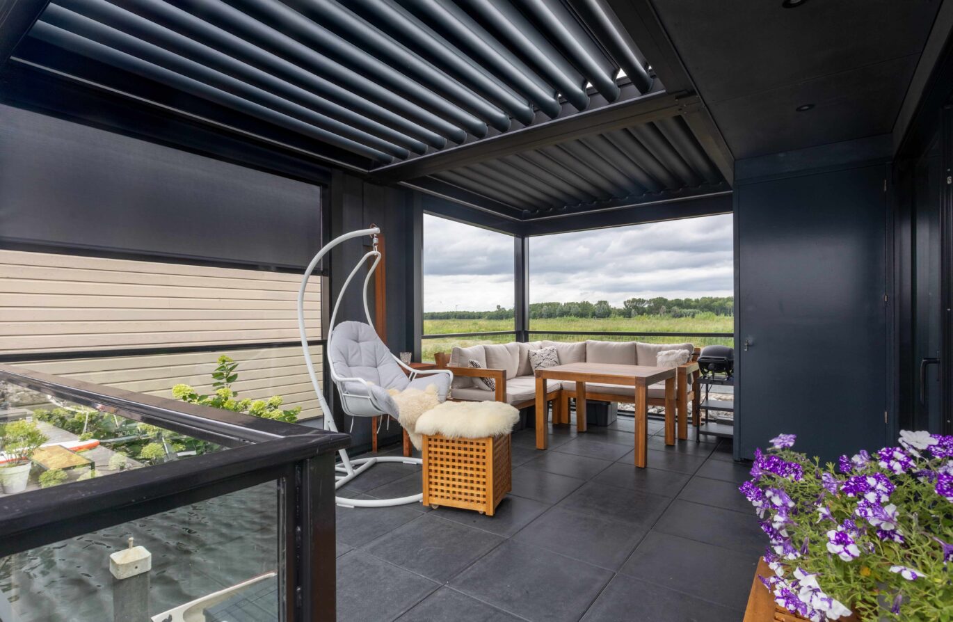 Deze prachtige waterwoning hebben we voorzien van een Brustor terrasoverkapping. De bewoners kunnen hierdoor extra lang genieten van de geweldige omgeving aan het water.