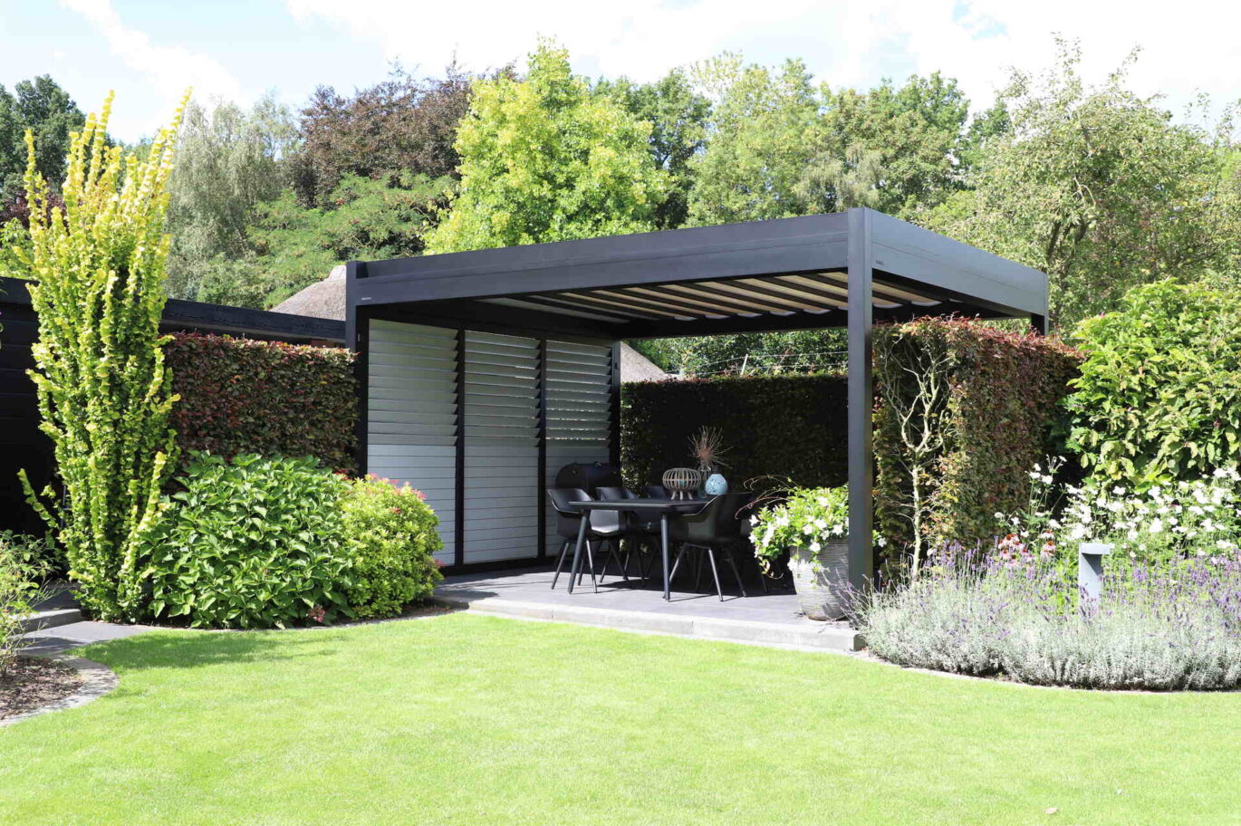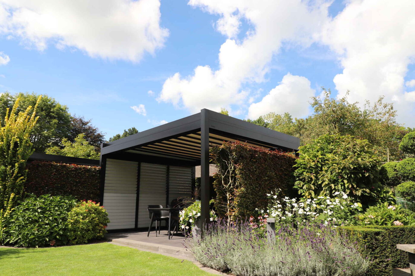 Een combinatie van strakke lijnen, moderne materialen en een tijdloos ontwerp. Het zorgt ervoor dat deze vrijstaande overkapping met vouwdak en waterdicht zeildoek naadloos aansluit bij de natuurlijke omgeving. Of het nu gaat om een ontspannende ochtendkoffie, een gezellige avond met vrienden of gewoon een rustige plek om te lezen, deze overkapping is de perfecte omgeving voor al deze momenten.