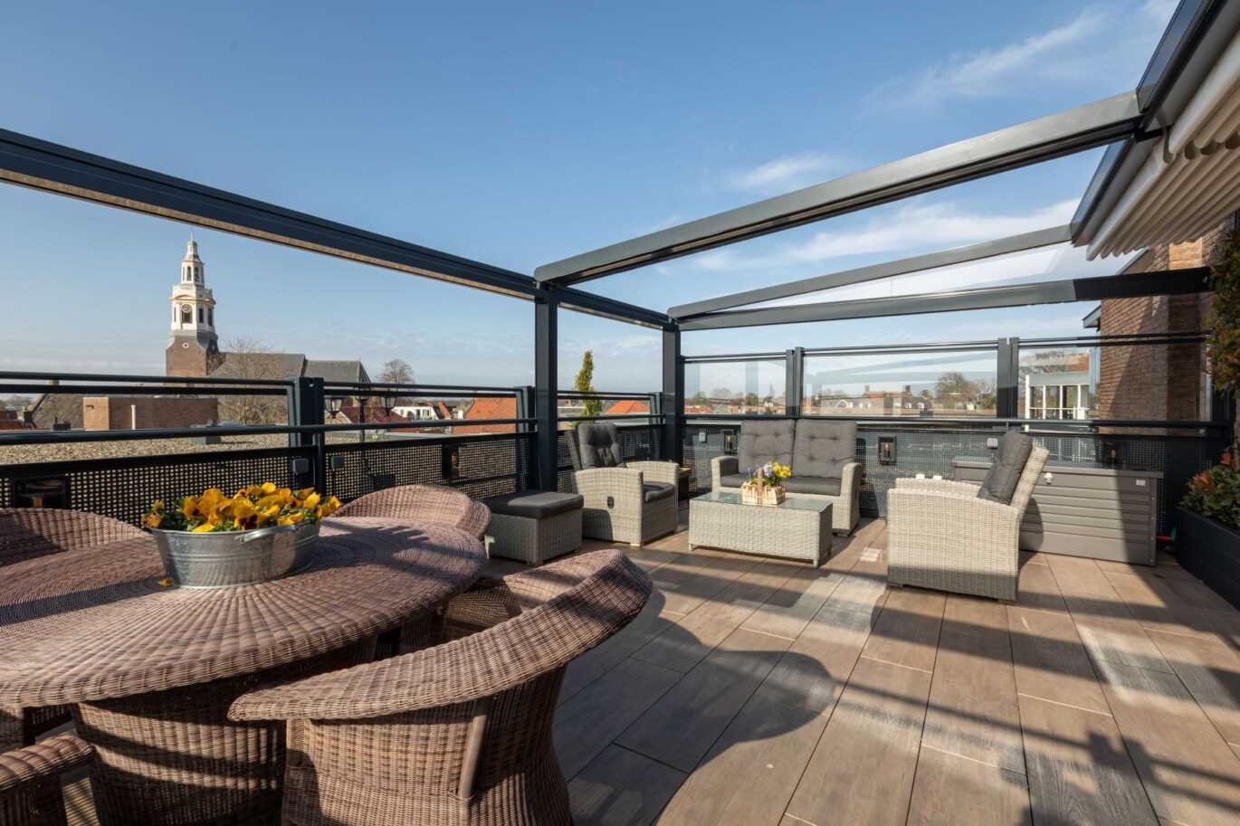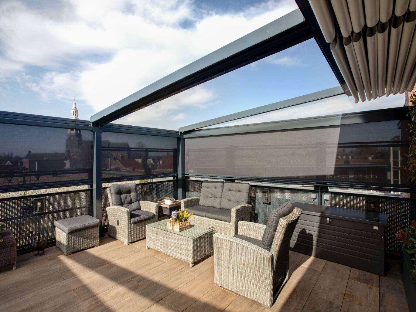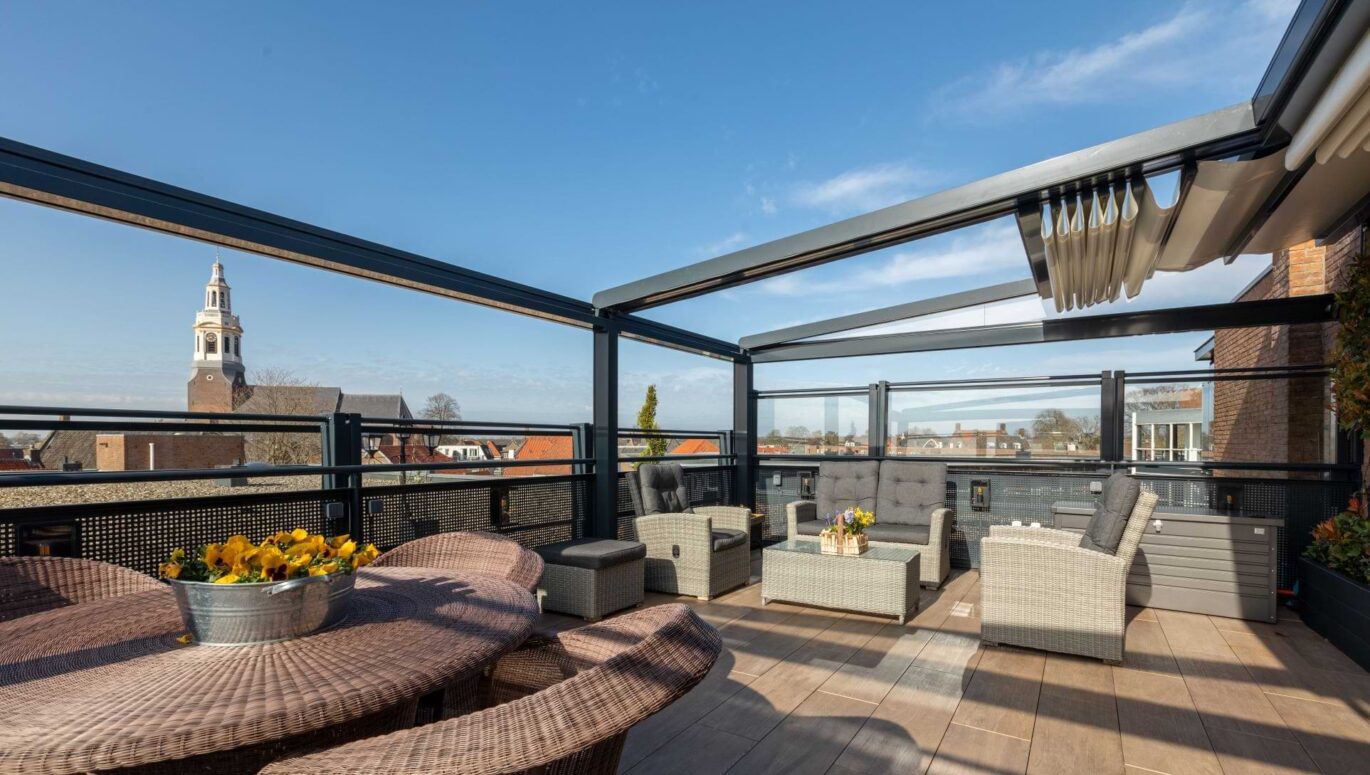 Dit schitterende, ruime dakterras is de ideale plek om te ontspannen en te genieten van het buitenleven in stijl. Dit terras is niet alleen groot en mooi aangelegd, maar is bovendien door ons uitgerust met een innovatieve pergola stretch, die het gehele terras kan afsluiten. Door het UV-bestendige en waterdichte pvc doek kunnen de bewoners het hele jaar door genieten van hun buitenruimte, ongeacht het weer.