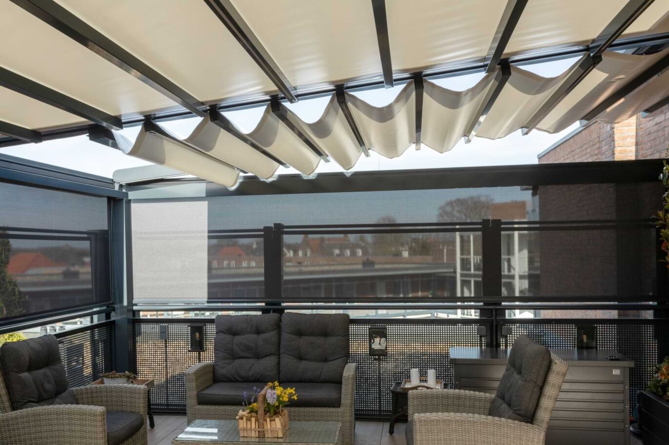 De stijlvolle en functionele pergola stretch is ontworpen om naadloos te integreren met de esthetiek van uw dakterras, waardoor een harmonieuze en uitnodigende sfeer ontstaat. Het ruime formaat van het terras maakt het perfect voor allerlei activiteiten, van rustige ochtenden met een kopje koffie tot gezellige avonden met vrienden en familie. Kortom de de perfecte plek om te ontspannen en te genieten van het beste wat buitenleven te bieden heeft.