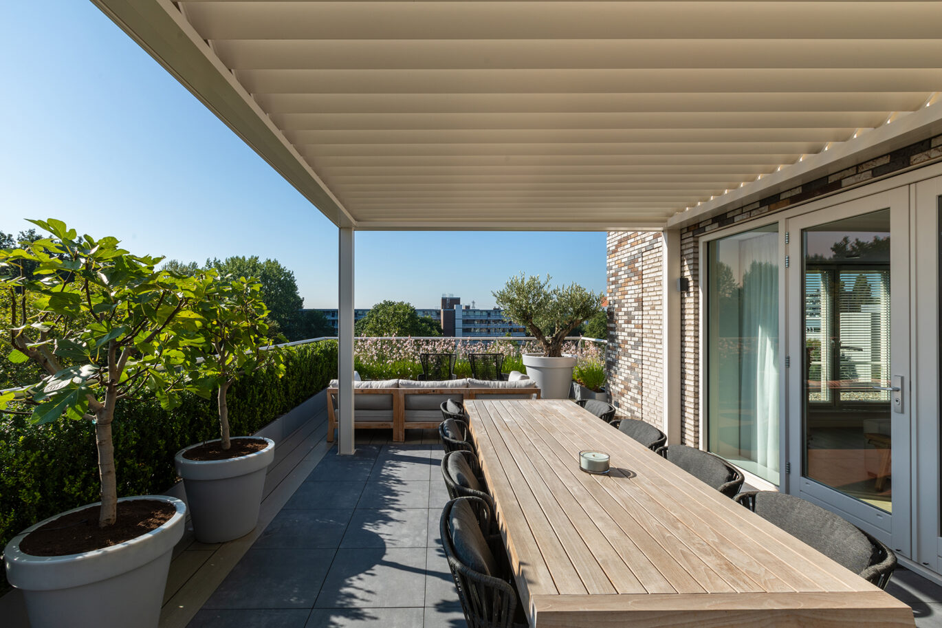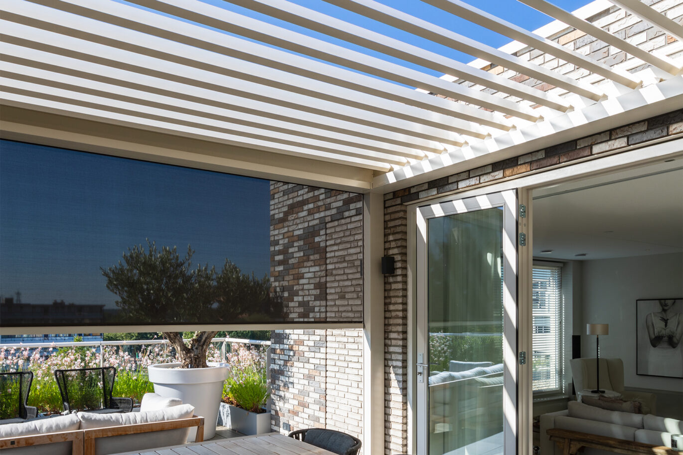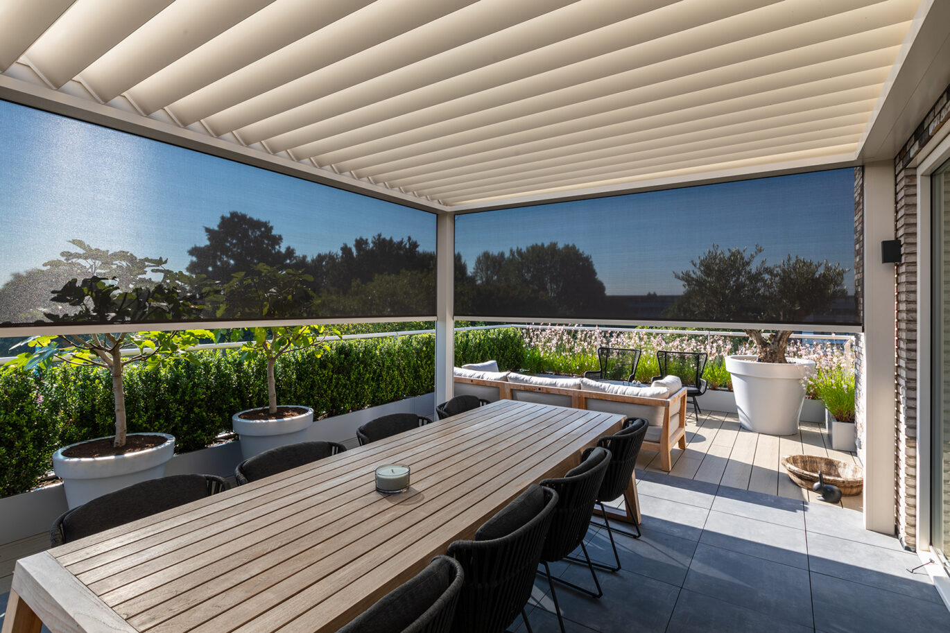 Bij deze pergola hebben we op een elegante manier schaduwvorming gecreëerd, namelijk door het gebruik van een lamellendak. Hierdoor is het ook bij volle zon aantrekkelijk buiten vertoeven. Op wat minder zonnige momenten worden de lamellen open gezet zodat de lichtinval in huis niet wordt beperkt.