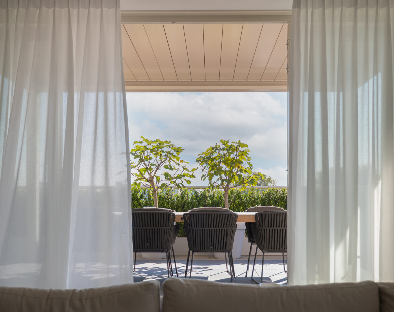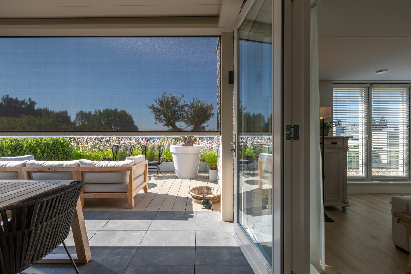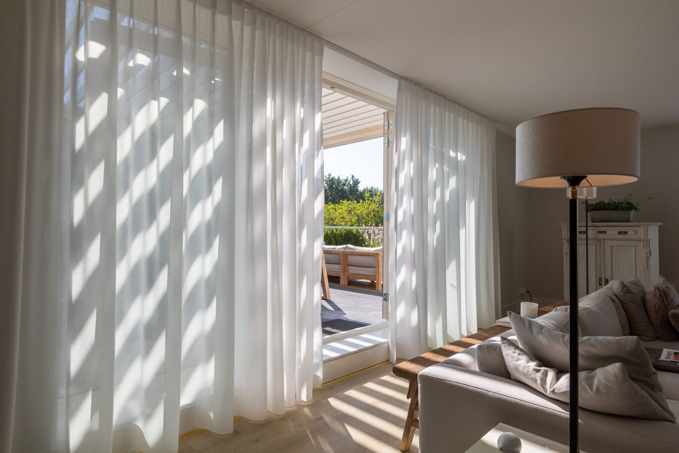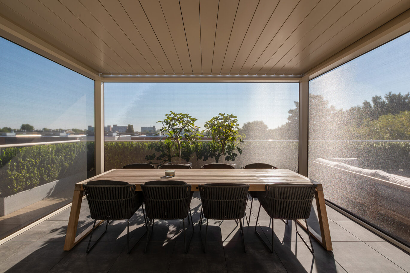 Bij deze pergola hebben we op een elegante manier schaduwvorming gecreëerd, namelijk door het gebruik van een lamellendak. Hierdoor is het ook bij volle zon aantrekkelijk buiten vertoeven. Op wat minder zonnige momenten worden de lamellen open gezet zodat de lichtinval in huis niet wordt beperkt.